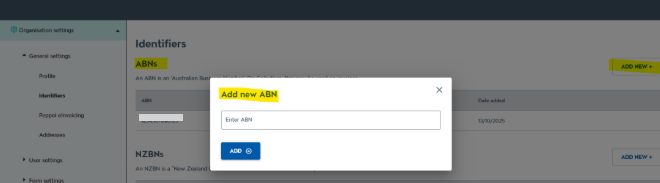 - Click on ADD NEW + next to ABNs. Enter your ABN here and click on ADD button.