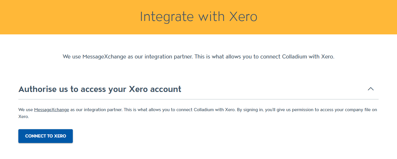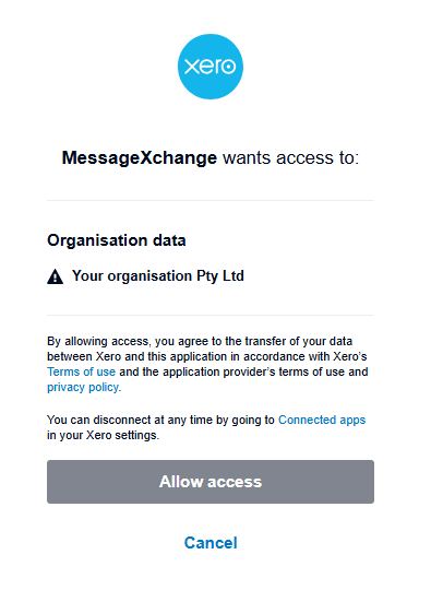 - Note: We use MessageXchange as our integration partner, so the message will ask you to connect MessageXchange to Xero.
