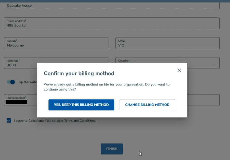 - You’ll then be taken to the billing page, where you can add further details, then click Finish.